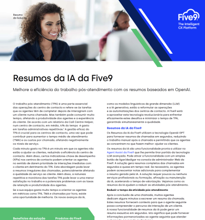 O Five9 AI Summaries utiliza a mesma tecnologia de IA generativa subjacente ao ChatGPT e fornece resumos das transcrições das chamadas dos clientes em segundos, reduzindo o trabalho manual após a chamada.