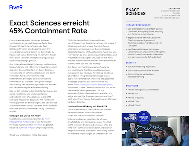 Exact Sciences, ein weltweit tätiges Molekulardiagnostik-Unternehmen, das sich auf die Erkennung von Krebserkrankungen im Frühstadium spezialisiert hat, sah sich mit den Herausforderungen eines unflexiblen IVR-Systems, der mangelnden Skalierbarkeit und eines überwältigenden Anrufvolumens konfrontiert, die mit der vor-Ort installierten Contact-Center-Lösung verbunden waren. Five9 kam zur Hilfe.
