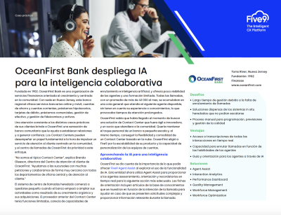 OceanFirst Bank desarrolló su misión de ofrecer un servicio de atención al cliente centrado en la comunidad al tiempo que modernizaba su centro de contacto sustituyendo los sistemas heredados e implementando IA para mejorar la habilidad y la eficiencia de los agentes. El cambio a la nube permite al banco:
