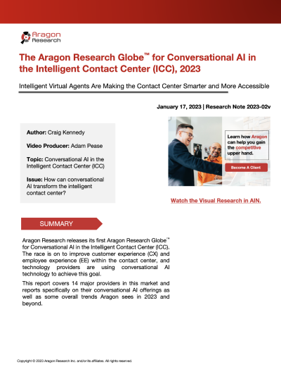 The Aragon Research Globe™ for Conversational AI in the Intelligent Contact Center, 2023 report identifies the key trends and capabilities driving contact centers. Aragon Research ranked Five9 highest for conversational AI strategy among 14 providers.