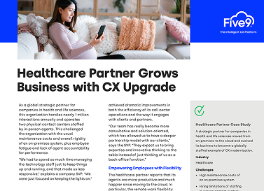 A healthcare partner delivering extensive support services transformed its contact center with Five9. It moved from on-premises to the cloud and became an internationally staffed leader in CX modernization.