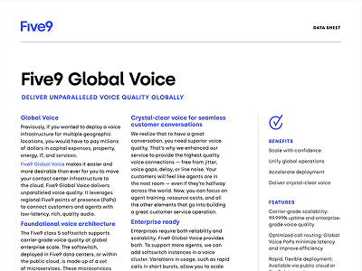 Five9 Global Voice makes it easier and more desirable than ever for enterprises to move their contact center infrastructure to the cloud. Use it to deliver extraordinary customer experiences anywhere in the world with carrier grade voice quality.