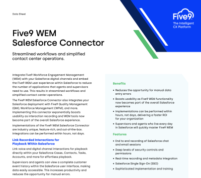 Integrate Five9 Workforce Engagement Management (WEM) with your Salesforce digital channels and embed the Five9 WEM user experience within Salesforce to reduce the number of applications that agents and supervisors need to use. This results in streamlined workflows and simplified contact center operations.